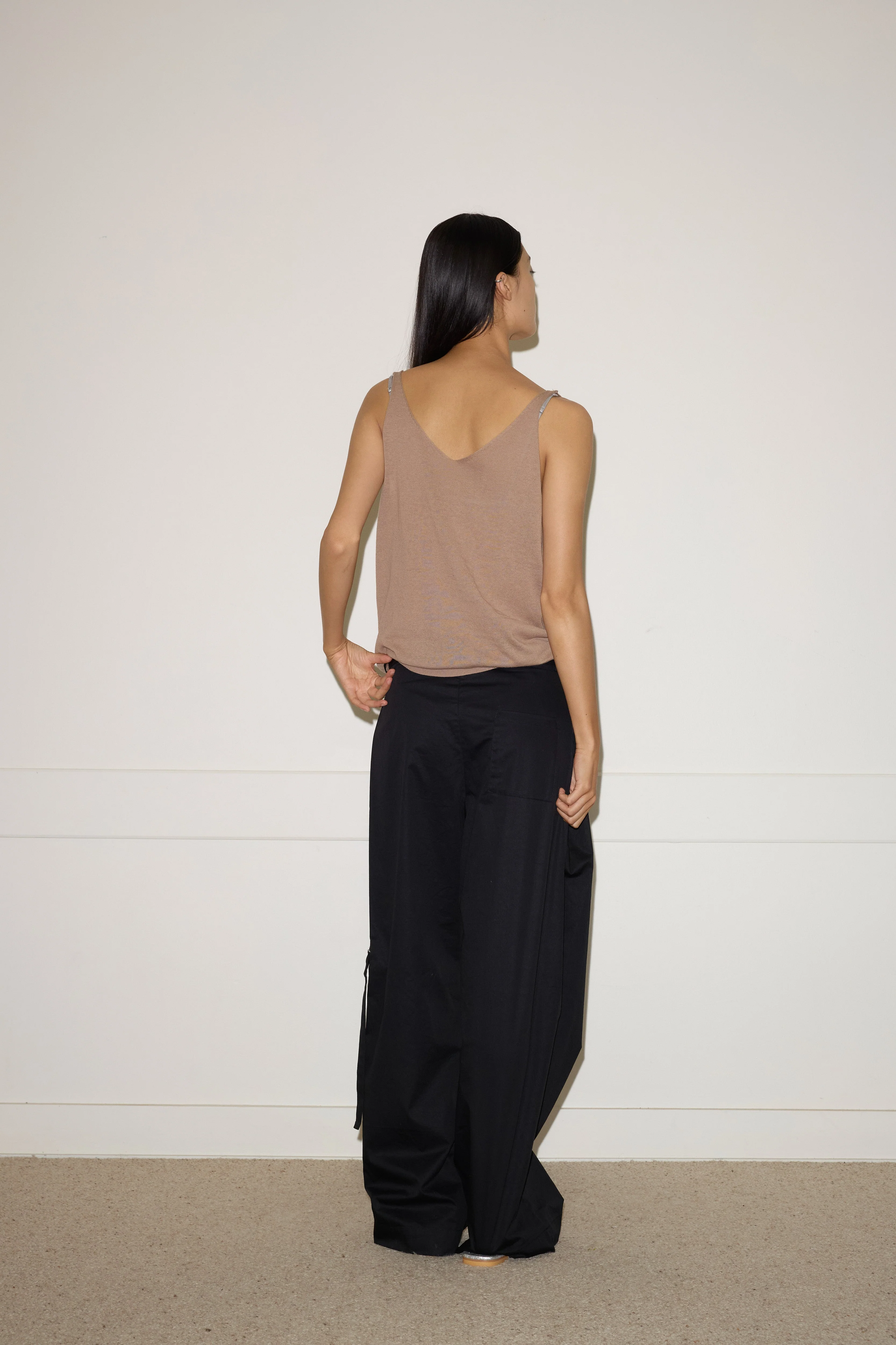 a fine knit relaxed tank with a rolled v neckline