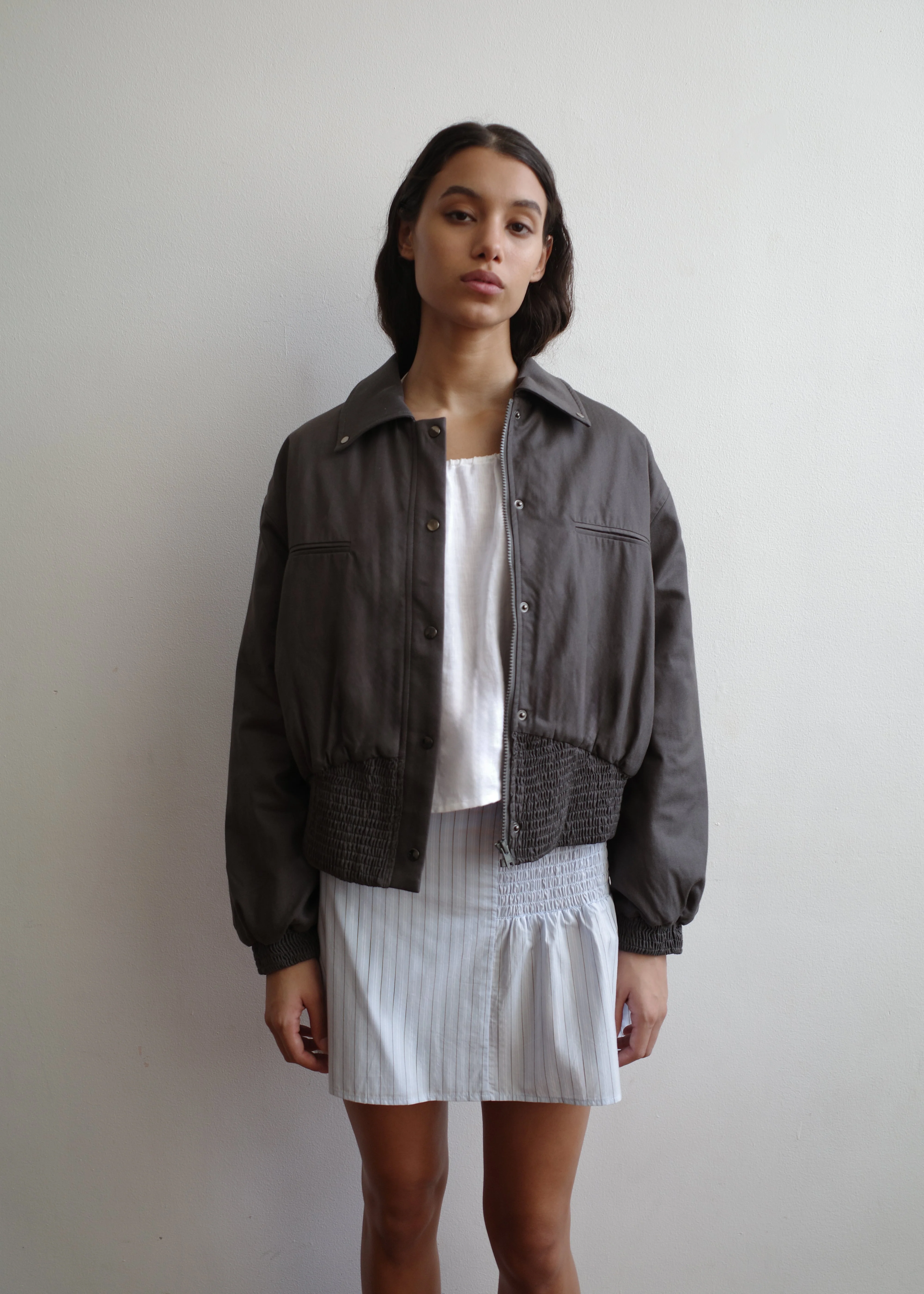 a playful yet refined mini skirt features invisible side zip, asymmetric shirred panel on the wearer's left side, a flat front waistband and soft elastic at the back