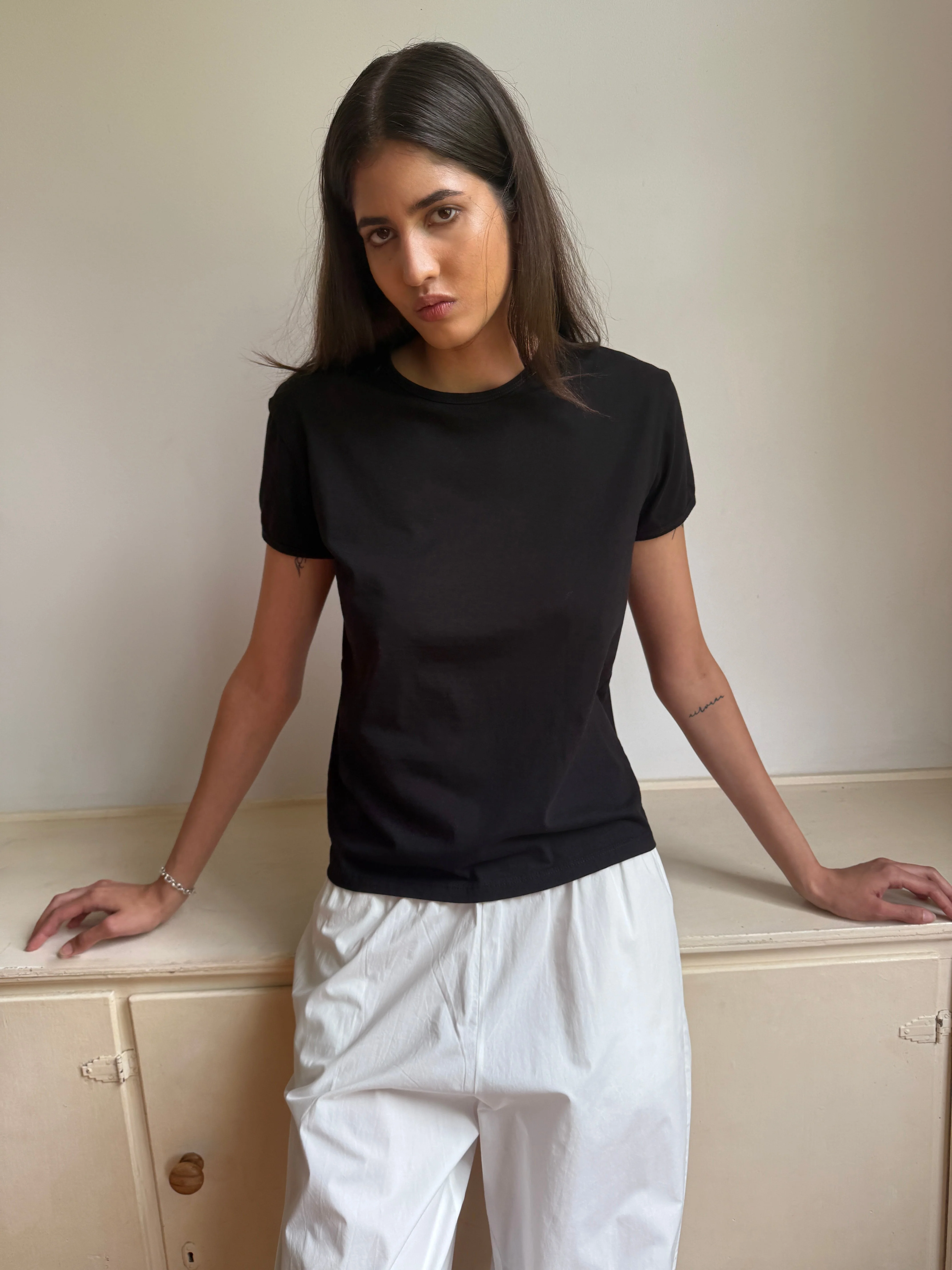 a classic everyday tee in soft organic cotton, designed in a relaxed fit and finished with a subtle bind on neck and sleeves