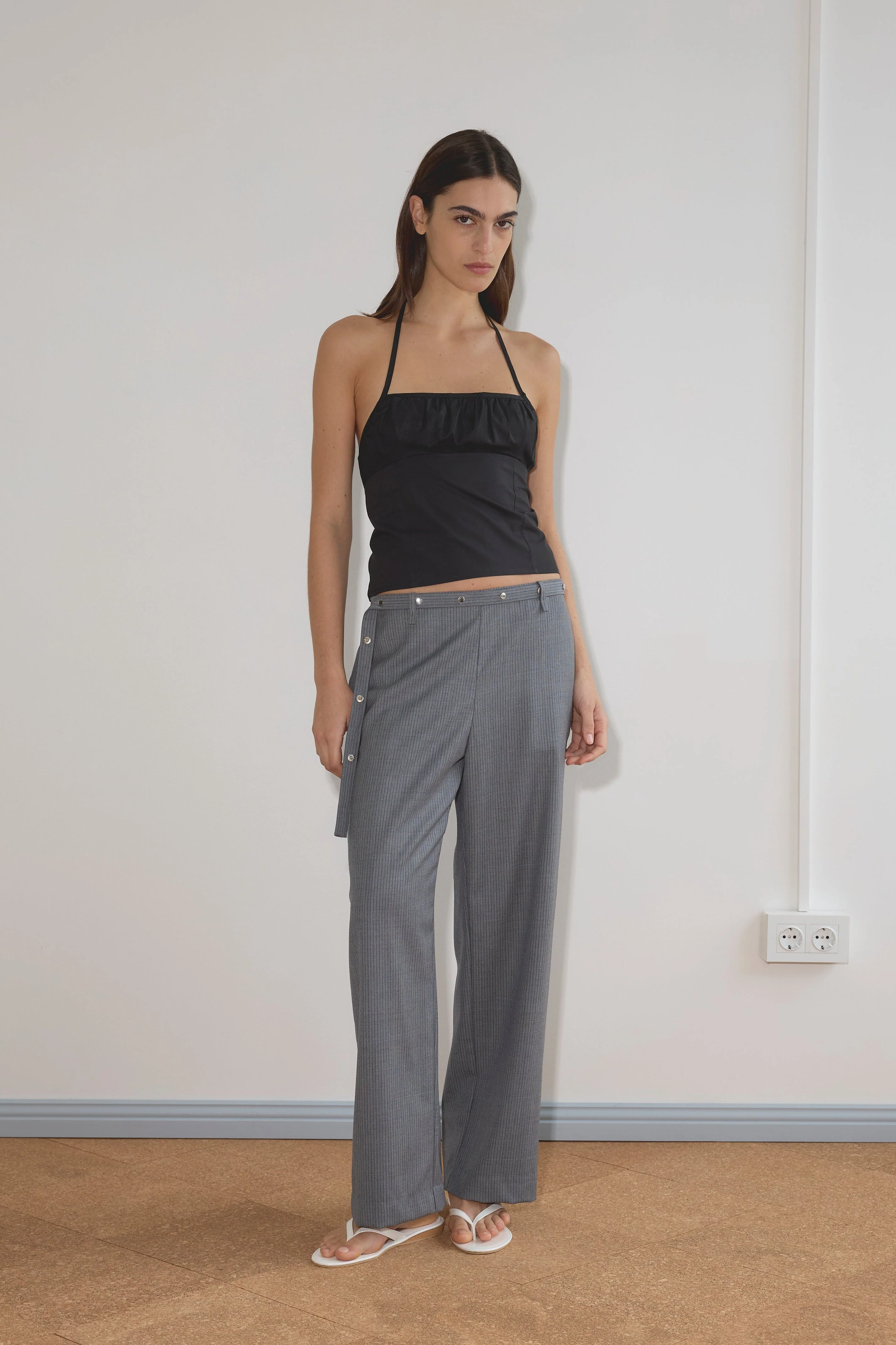 halter top featuring gathered bust panel, flattering straight neckline, fine tie halter straps and shirred back