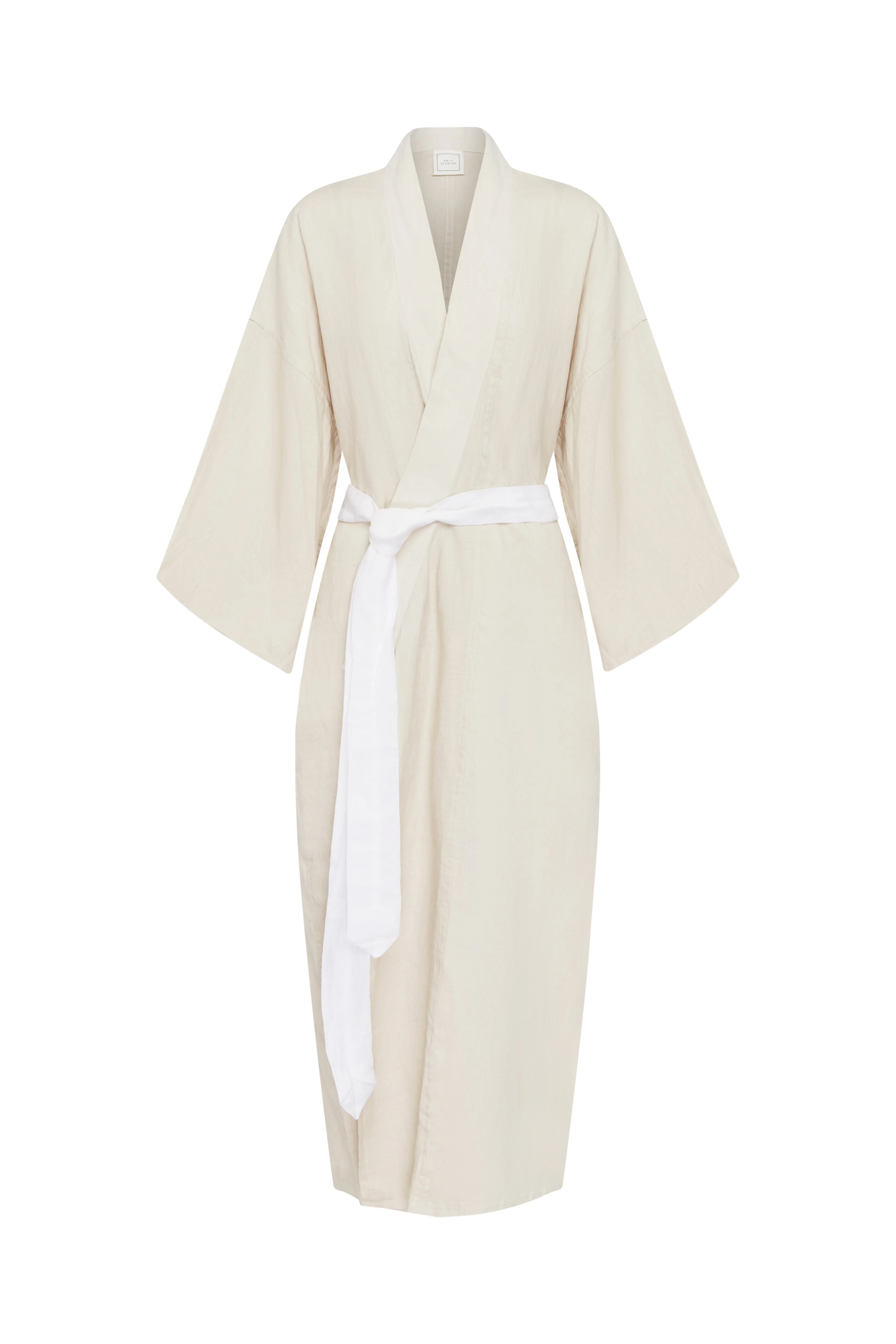 features a contrasting white linen waist tie, extra wide sleeves and low hidden pockets on the side seamsĀ