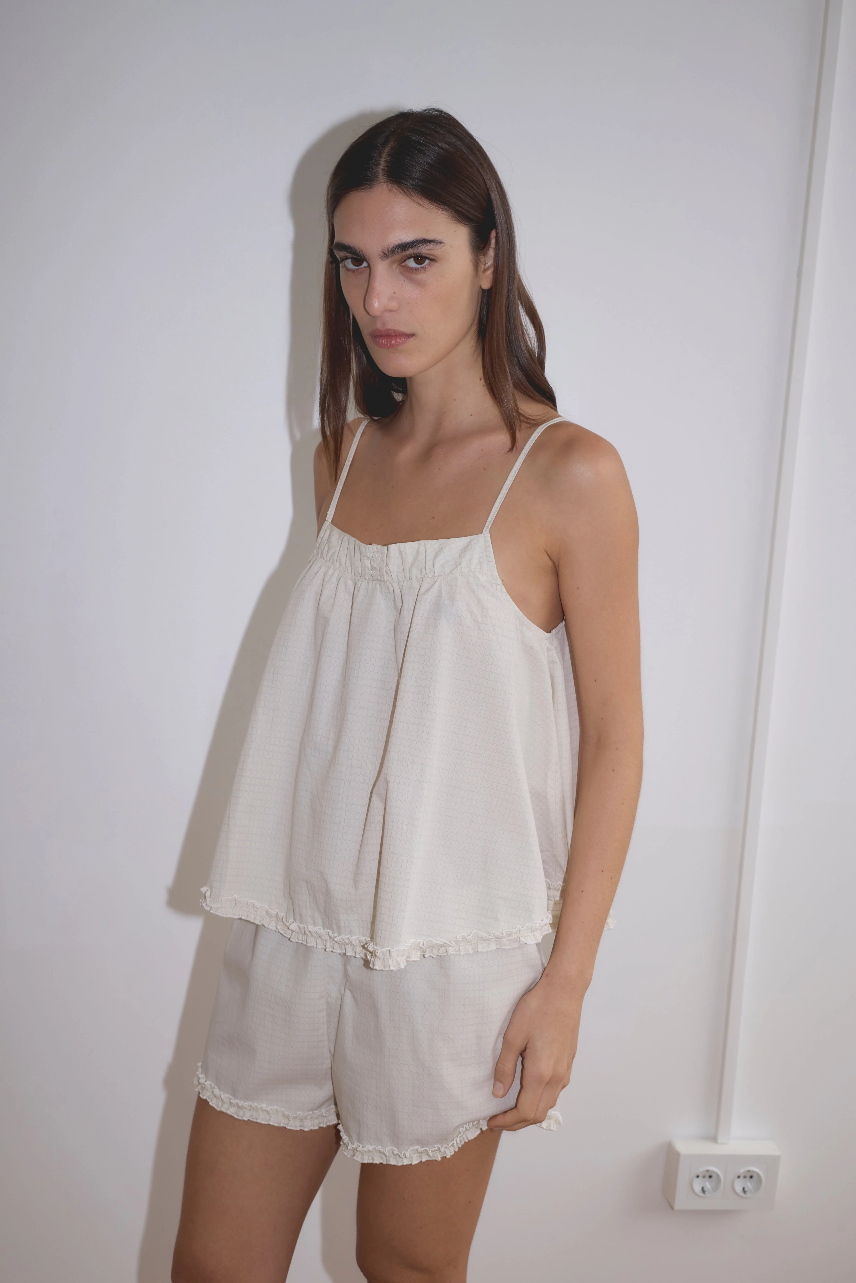 relaxed babydoll top featuring flattering straight neckline with button closure, gathered yoke seam, lettuce frill hem detail and fine, adjustable straps pairs back with an easy pull on short featuring double button detailing, elastic waistband and baby lock lettuce frill hem